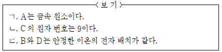 A~D에 대한 설명으로 옳은 것만을 <보기>에서 있는 대로 고른 것은? (단, A~D는 임의의 원소 기호이다.)