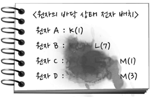 그림은 원자 A~D의 바닥 상태 전자 배치를 기록한 노트의 일부가 물에 젖어 글씨가 번져 있는 모습을 나타낸 것이다.