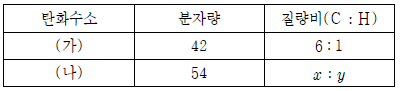 표는 수소(H) 원자 수가 동일한 탄화수소 (가)와 (나)의 분자량과 구성 성분 원소의 질량비를 나타낸 것이다.