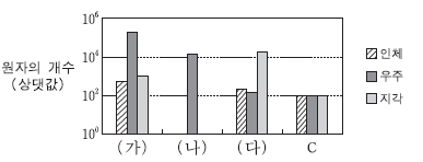 그림은 인체, 우주, 지각에 포함된 탄소 (C) 원자의 개수를 각각 100이라고 할 때 인체, 우주, 지각에 분포하는 원소 (가), (나), (다)의 원자의 개수를 상댓값으로 나타낸 것이다. (가)~(다)는 각각 H, He, O중 하나이다.