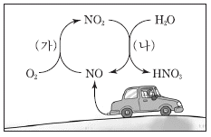 그림은 산성비의 원인 물질인 질산 (HNO3)이 생성되는 과정 중 하나를 나타낸 것이다.
