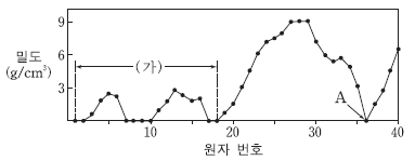 그림은 25℃, 1기압에서 원소의 밀도를 원자 번호 1에서 40까지 나타낸 것이다.
