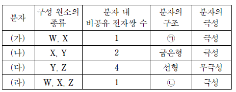 표는 원소 W~Z로 이루어진 안정한 분자 (가)~(라)에 대한 자료이다. W~Z는 각각 H, C, N, O중 하나이며 분자당 구성 원자 수는 4개이하이다.