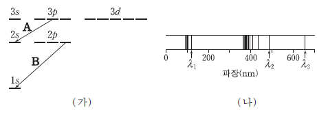 그림 (가)는 수소 원자 오비탈의 에너지 준위와 전자 전이 A, B를 나타낸 것이고, (나)는 수소 원자의 선 스펙트럼에서 가시광선 영역과 자외선 영역을 모두 나타낸 것이다.
