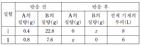 표는 반응 전후의 기체에 대한 자료이며, A는 분자량이 2이다.