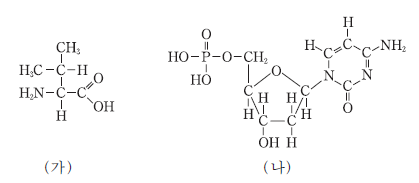 그림 (가)는 아미노산 중 하나를, (나)는 뉴틀레오타이드 중 하나를 나타낸 것이다.