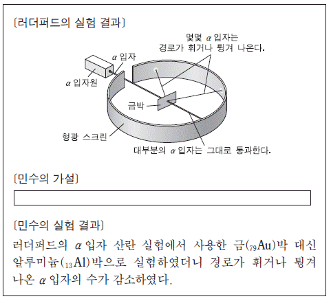 다음은 러더퍼드의 a입자(He2+)산란 실험 결과와 이를 토대로 민수가 가설을 세운 후 수행한 실험이다.