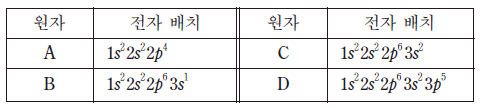 표는 원자 A~D 바닥 상태 전자 배치를 나타낸 것이다.