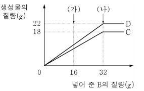 그림은 일정한 질량의 A가 들어 있는 용기에 B를 조금씩 넣어 주면서 반응시켰을 때, 넣어 준 B의 질량에 따른 생성물 C와 D의 질량을 나타낸 것이다. (가), (나)는 각각 B를 16 g, 32 g 넣었을 때이다.