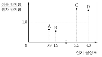 그림은 2, 3주기 원소 A ~ D의 전기 음성도와