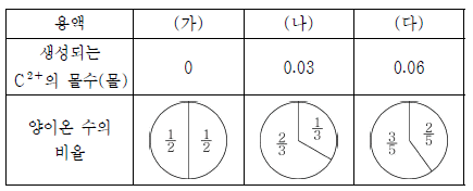 표는 금속 양이온 A3+과 B+이 들어 있는 수용액에 금속 C를 넣었을 때, 반응이 진행됨에 따라 생성되는 C2+의 몰수와 용액 속에 존재하는 양이온 수의 비율을 이온의 종류에 관계없이 나타낸 것이다. 용액 (가)~(다)에는 각각 2가지 양이온만 존재한다.