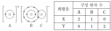 그림은 화합물 ABC의 화학 결합 모형을, 표는 화합물 X, Y의 화학식의 구성 원자 수를 나타낸 것이다.