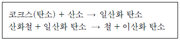 다음은 용광로에서 산화철을 철(Fe)로 제련할 때 일어나는 화학 반응이다.