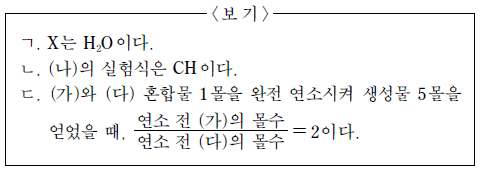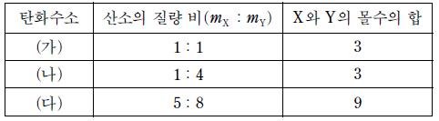 표는 탄화수소 (가)~(다) 각각 1 몰을 완전 연소시켜 얻은 생성물 X와 Y에 대한 자료이다. mX는 전체 X에 포함된 산소의 질량이고, mY는 전체 Y에 포함된 산소의 질량이다.