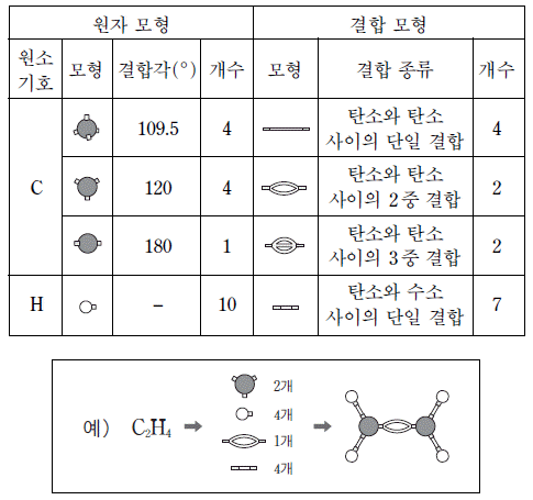 표는 탄화수소의 분자 모형을 조립할 수 있는 세트의 구성을, 그림은 이 세트로 조립한 C2H4 분자 모형의 예를 나타낸 것이다.