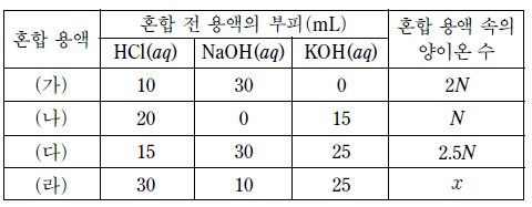표는 HCl(aq), NaOH(aq), KOH(aq)의 부피를 달리하여 혼합한 용액 (가)~(라)에 대한 자료이다.