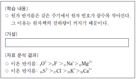 다음은 철수가 원자 반지름의 주기적 변화를 학습한 후, 이를 토대로 가설을 세우고 자료 분석을 수행한 결과이다.