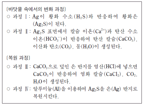 다음은 은(Ag) 반지가 바닷물 속에서 변화되는 과정과 은 반지를 복원시키는 과정에 대한 설명이다.