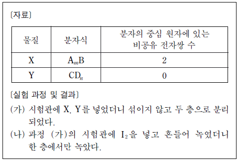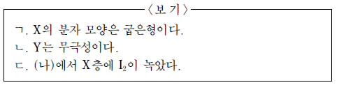 다음은 25 ℃, 1 기압에서 액체인 물질 X, Y에 대한 자료와 X, Y에 아이오딘(I2)을 첨가하는 실험이다.