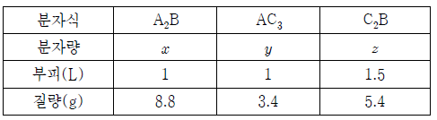 표는 같은 온도와 압력에서 원소 A~C로 이루어진 기체에 대한 자료이다.
