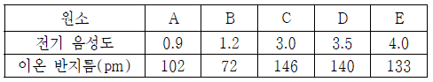 표는 원소 A~E의 전기 음성도와 안정한 이온의 반지름을 나타낸 것이다. 이온의 전자 배치는 모두 네온(Ne)과 같다.