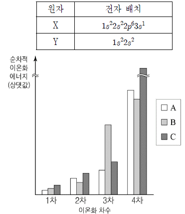표는 원자 X, Y의 전자 배치를, 그림은 2~3주기 원소 A~C의 순차적 이온화 에너지를 나타낸 것이다.