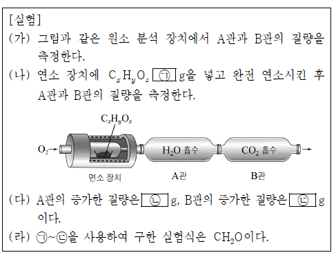다음은 탄소 화합물(CxHyOz)의 원소 분석 실험이다. H, C, O의 원자량은 각각 1, 12, 16이다.
