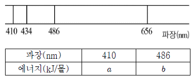 그림은 수소 원자의 선 스펙트럼에서 가시광선 영역을, 표는 파장에 해당하는 전자 전이가 일어날 때 방출되는 빛의 에너지를 나타낸 것이다.