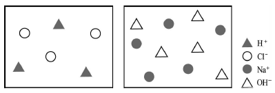 그림은 HCl x몰과 NaOH y몰을 각각 증류수에 녹여 HCl(aq), NaOH(aq)을 30 mL씩 만들었을 때, 단위 부피 속에 존재하는 이온의 입자 모형을 나타낸 것이다.