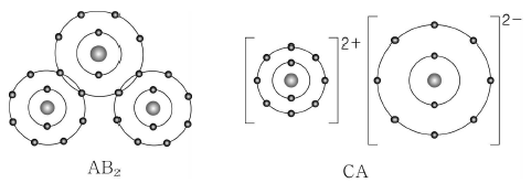 그림은 화합물 AB2와 CA의 화학 결합을 모형으로 각각 나타낸 것이다.