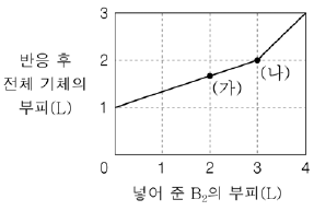 그림은 1 L의 A2(g)가 들어 있는 실린더에 B2(g)를 부피를 달리하여 넣고 반응시켰을 때, 넣어 준 B2의 부피에 따른 반응 후 전체 기체의 부피를 나타낸 것이다.