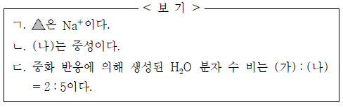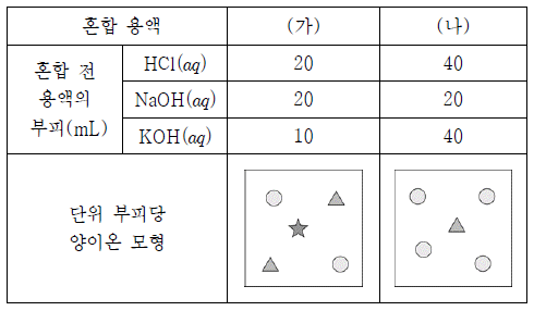 표는 HCl(aq), NaOH(aq), KOH(aq)을 부피를 달리하여 혼합한 용액 (가), (나)에 대한 자료이다.