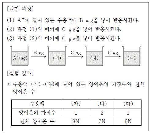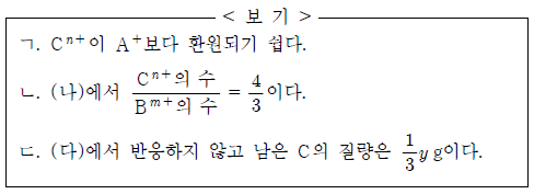이에 대한 옳은 설명만을 <보기>에서 있는 대로 고른 것은? (단, A ~ C는 임의의 원소 기호이고, B와 C는 물과 반응하지 않으며, 음이온은 반응에 참여하지 않는다.) [3점]