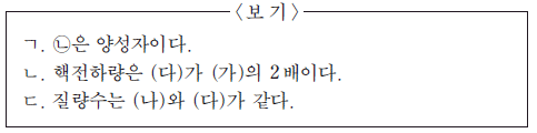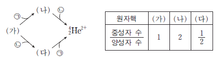 이 만들어지는 과정을 나타낸 것이고, 표는 원자핵 (가)~(다)에 대한 자료이다. ㉠과 ㉡은 각각 양성자와 중성자 중 하나이다.