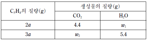 표는 탄화수소 CxHy의 질량을 달리하여 완전 연소시켰을 때 생성되는 CO2 와 H2O의 질량에 대한 자료이다.