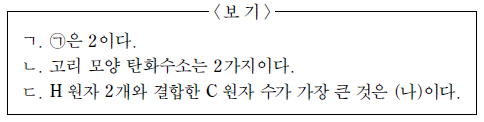 이 특징을 모두 갖는 물질만을 <보기>에서 있는 대로 고른 것은? (단, C의 원자량은 12 이다.) [3점]