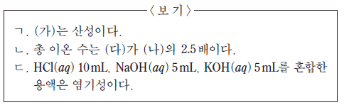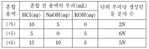 표는 HCl(aq), NaOH(aq), KOH(aq)의 부피를 달리하여 혼합한 용액 (가)~(다)에 대한 자료이다.