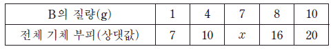 표는 A(g) wg 이 들어 있는 실린더에 B(g)를 넣고 반응시켰을 때, B의 질량에 따른 반응 후 전체 기체 부피에 대한 자료이다.