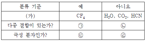 표는 4가지 분자 H2O, CO2, HCN, CF4를 주어진 기준에 따라 각각 분류한 결과를 나타낸 것이다.