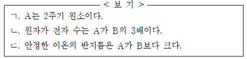 A와 B에 대한 옳은 설명만을 <보기>에서 있는 대로 고른 것은? (단, A, B는 임의의 원소 기호이다.) [3점]