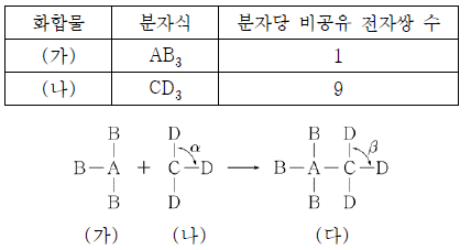 표는 1, 2주기 원소 A ~ D로 이루어진 화합물 (가), (나)에 대한 자료이고, 그림은 (가)와 (나)가 반응하여 (다)를 생성하는 반응을 나타낸 것이다.