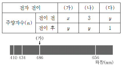 표는 수소 원자의 전자 전이 (가)~(다)에 대해 전이 전과 후의 주양자수(n)를, 그림은 수소 원자의 선 스펙트럼에서 가시광선 영역을 나타낸 것이다.