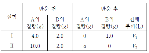 표는 실린더에 기체 A와 B를 넣고 반응시켰을 때 반응 전과 후 기체에 대한 자료이다.