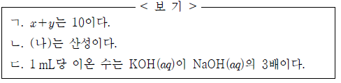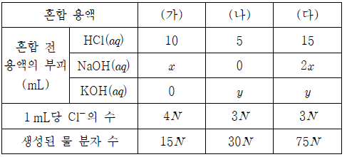 표는 HCl(aq), NaOH(aq), KOH(aq)의 부피를 달리하여 혼합한 용액 (가)~(다)에 대한 자료이다.
