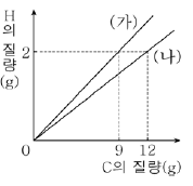 그림은 분자당 수소 원자 수가 같은 탄화수소 (가), (나)에서 탄소(C)와 수소(H)의 질량 관계를 나타낸 것이다.