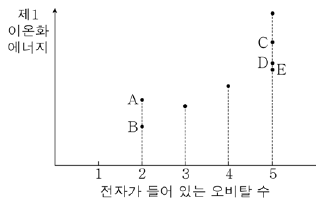 그림은 2주기 원소의 제1 이온화 에너지와 바닥 상태 원자에서 전자가 들어 있는 오비탈 수를 나타낸 것이다.