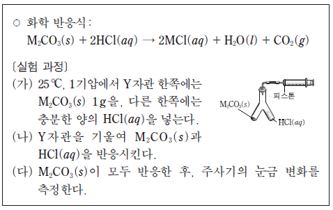 이 실험으로부터 금속 M의 원자량을 구하기 위해 반드시 이용해야 할 자료만을 <보기>에서 있는 대로 고른 것은? (단, M은 임의의 원소 기호이고, 온도와 압력은 일정하며, 피스톤의 마찰은 무시한다.) [3점]