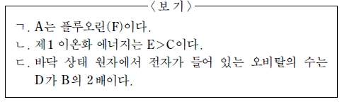 이에 대한 설명으로 옳은 것만을 <보기>에서 있는 대로 고른 것은? (단, A~E는 임의의 원소 기호이다.) [3점]