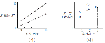 [과목 구분 없음] 그림 (가)는 2 주기 원소의 원자 번호에 따른 핵전하(Z)와 원자가 전자가 느끼는 유효 핵전하(Z*)를 나타낸 것이고, (나)는 2 주기 원소 A~E의 바닥 상태 원자의 전자 배치에서 홀전자 수에 따른 Z 와 Z*의 차(Z-Z*)를 나타낸 것이다.