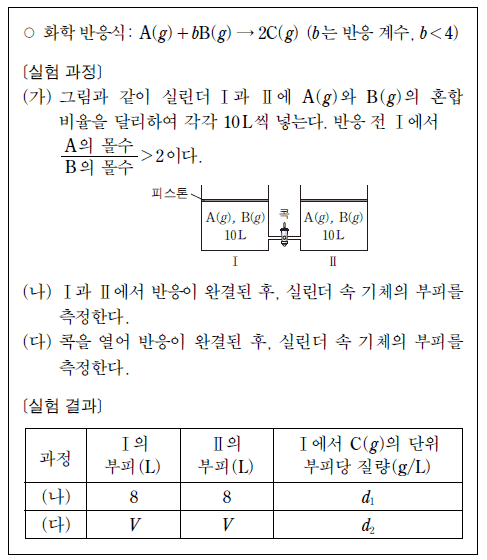 [과목 구분 없음] 다음은 A(g)와 B(g)가 반응하는 화학 반응식과 실험이다.